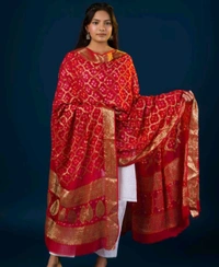 This ethnic dupattas for women will make it your favorite tag along accessory for any occasion, either casual wear or office wear. Pair it with your kurta and bottoms with heels for a perfect and gorgeous look. Bandhani Women’s pure Georgette Dupatta 2.4 Meter Long 1.2 Meter Wide. Perfect Over Plain Suits or Lehenga Choli, Handmade with Tie-Dye Rajasthani Jaipuri Bandhej Work This dupatta can be paired with any color of dress and any type of dress This Indian Dupatta With Both Ethnic And Western Outfits For A Timeless Appealing Style These Dupatta's exact match for Traditional wear sets or any ethnic sets It Gracefully Add Style To Your Attire & Match With Your Confide shiny silk fabric - banarasi fabric with broad zari borders and checks pattern